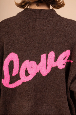 Made from soft, plush knit, the Brown Love sweater offers ultimate comfort. The loose and relaxed fit creates a cosy look, while the ribbed high neck collar provides a slightly fitted feel. The long and wide sleeves give a loose effect, and the back detail features a large "LOVE" inscription in a bright pink contrasting knit.