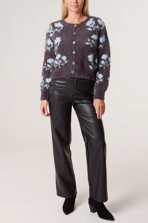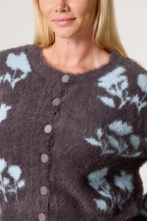 Fluffy floral cardi in grey and blue. Pair with satin skirt or jeans and boots.