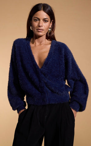 Dancing Leopard Navy Cardigan. This super soft with long sleeves featuring dropped shoulders and fitted cuffs. Three covered buttons.